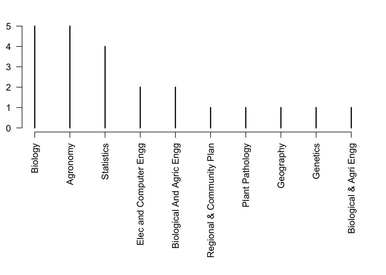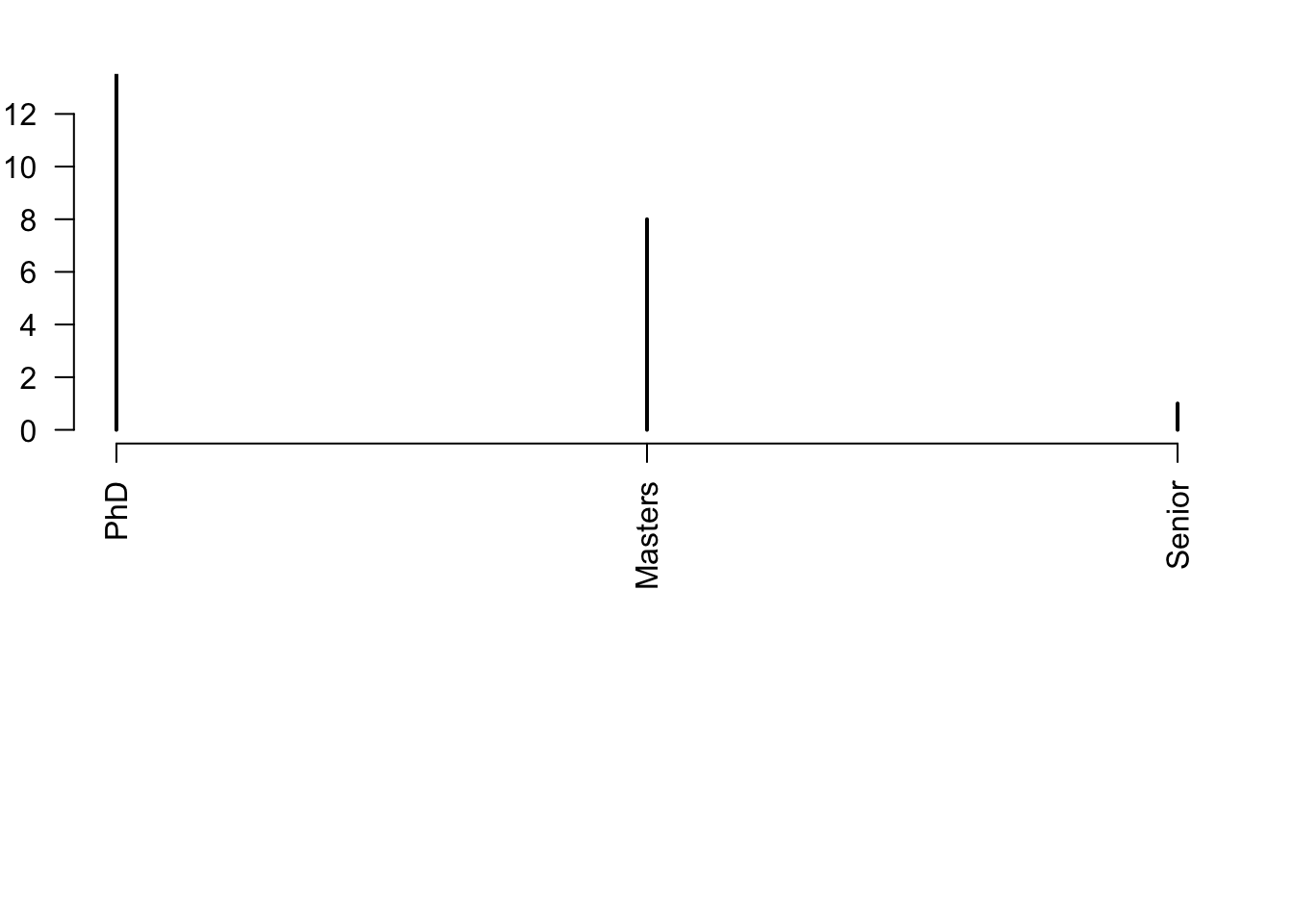 par(mar=c(13,2,2,2)) plot(rev(sort(table(df$classLevel))),las=2,xlab="",ylab="Number of students",ylim=c(0,13))