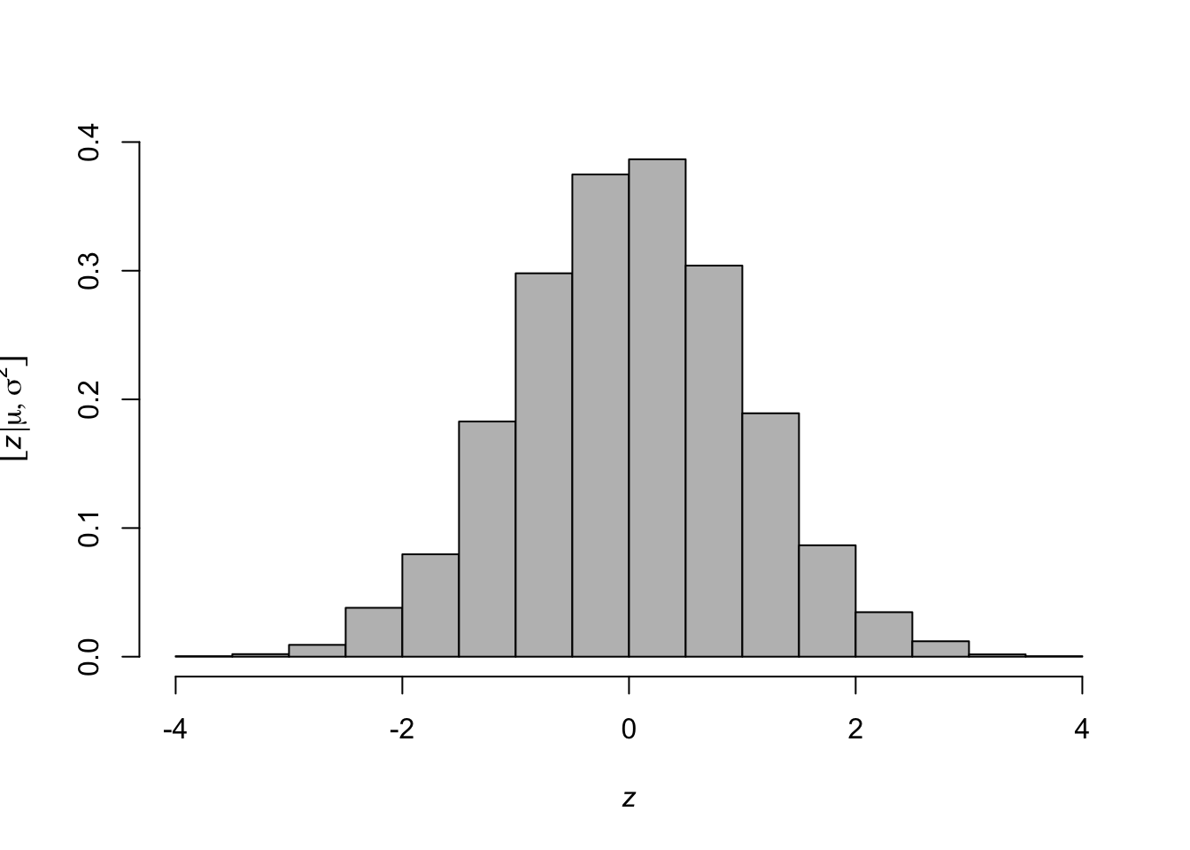 library(latex2exp) z <- rnorm(n = 10000, mean = 0, sd = 1) hist(z,freq=FALSE,col="grey",main = "", xlab= TeX('$\\textit{z}$'), ylab = TeX('$\\lbrack\\textit{z}|\\mu,\\sigma^2\\rbrack$'))