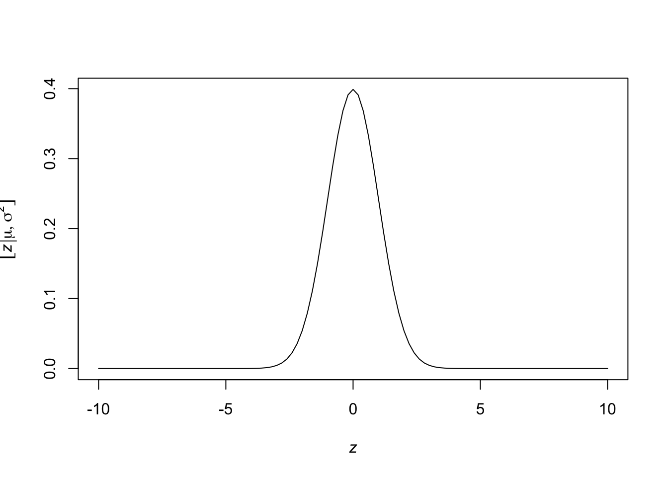 curve(expr = dnorm(x = x, mean = 0, sd = 1), from = -10, to = 10, xlab= TeX('$\\textit{z}$'), ylab = TeX('$\\lbrack\\textit{z}|\\mu,\\sigma^2\\rbrack$'))
