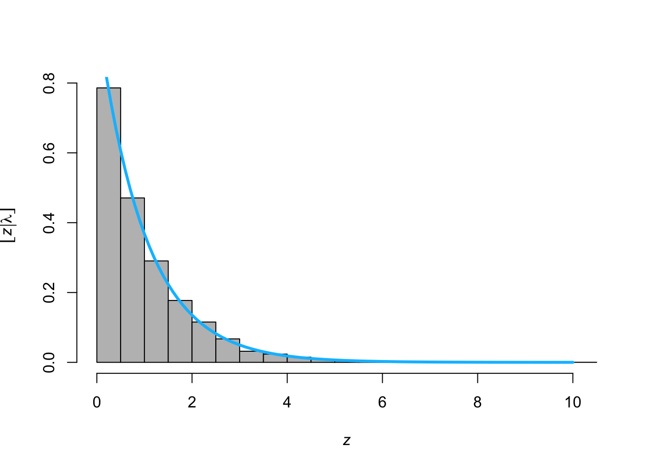z <- rexp(n = 10000, lambda = 1) hist(z,freq=FALSE,col="grey",main = "", xlab= TeX('$\\textit{z}$'), ylab = TeX('$\\lbrack\\textit{z}|\\lambda\\rbrack$')) curve(expr = dexp(z = x,lambda = 1), from = 0, to = 10, add = TRUE,col = "deepskyblue",lwd = 3)