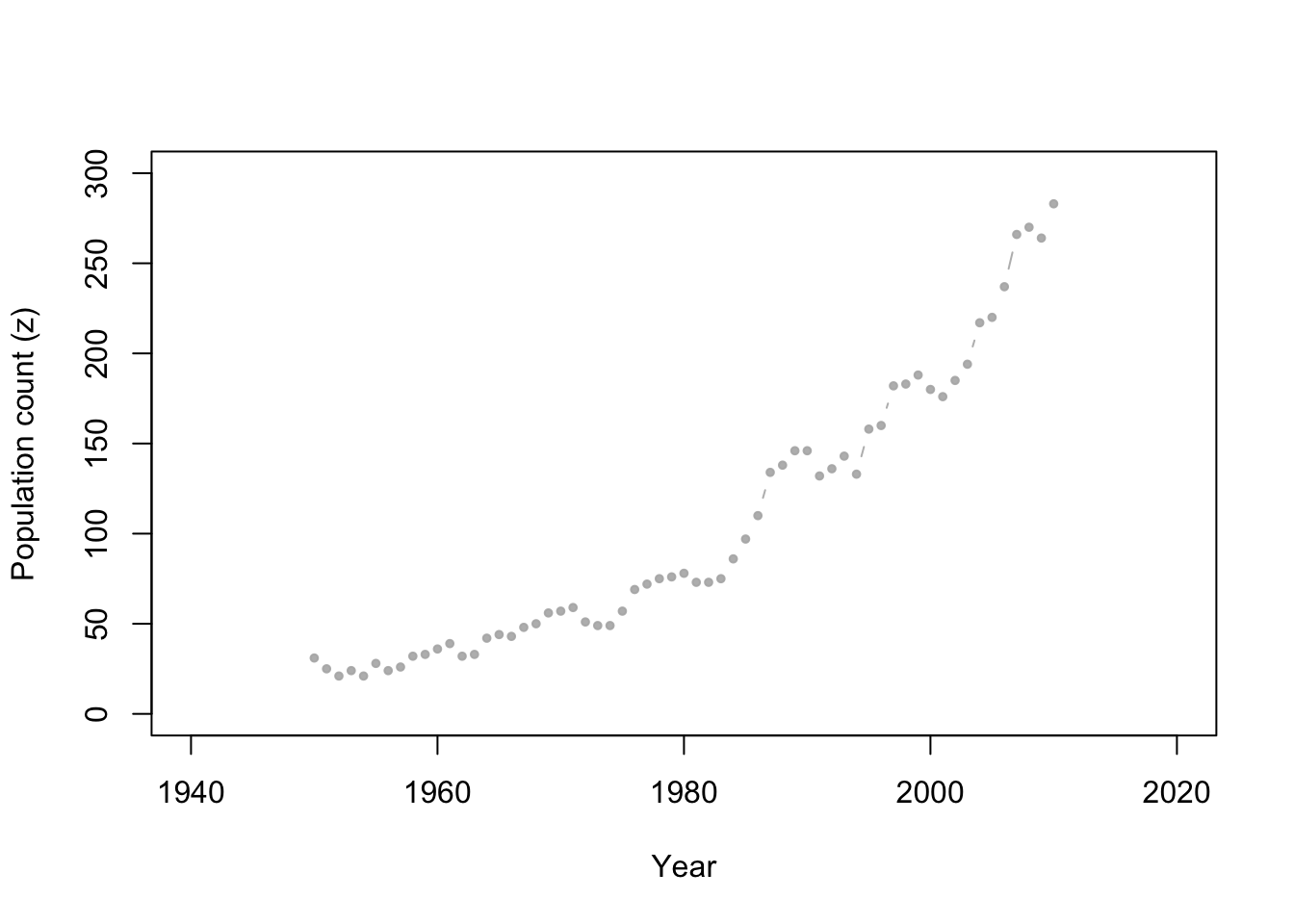 url <- "https://www.dropbox.com/scl/fi/kxzc8fmomkigcrxyjjmdp/Butler-et-al.-Table-1.csv?rlkey=61ey3q1jc4rsor257uy4080j3&dl=1" df1 <- read.csv(url) plot(df1$Winter, df1$N, xlab = "Year", ylab = "Population count (z)", xlim = c(1940, 2020), ylim = c(0, 300), typ = "b", cex = 0.8, pch = 20, col = rgb(0.7, 0.7, 0.7, 0.9))